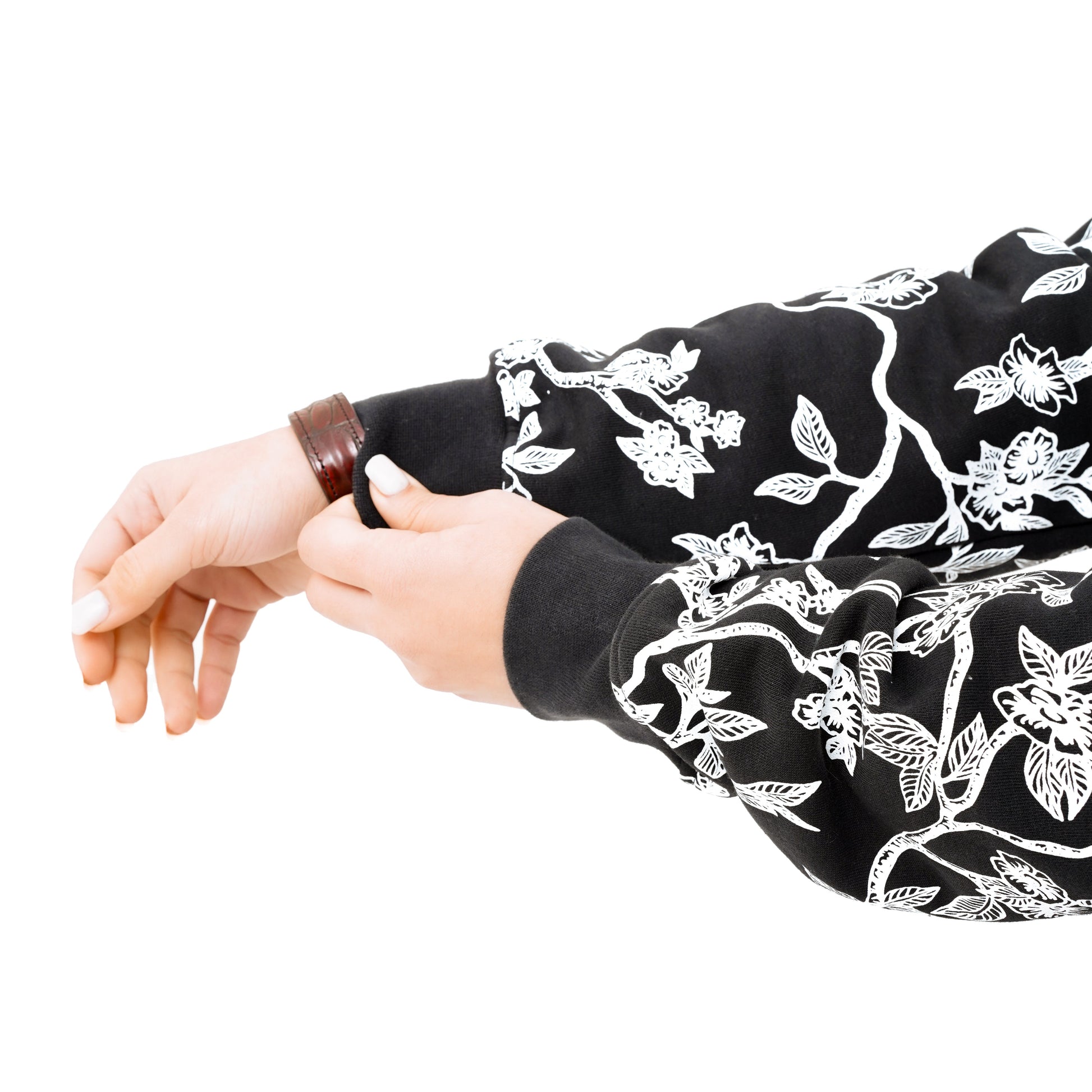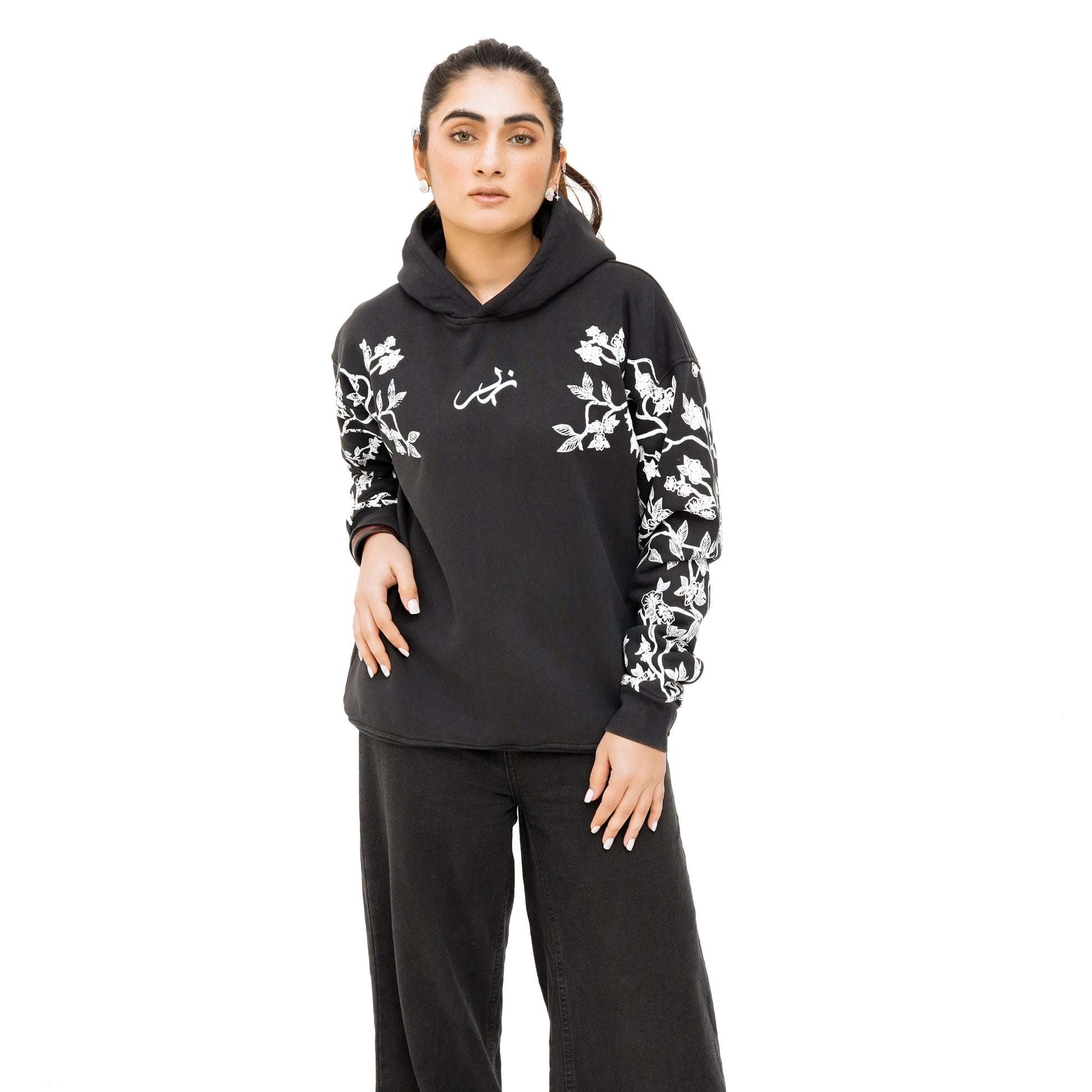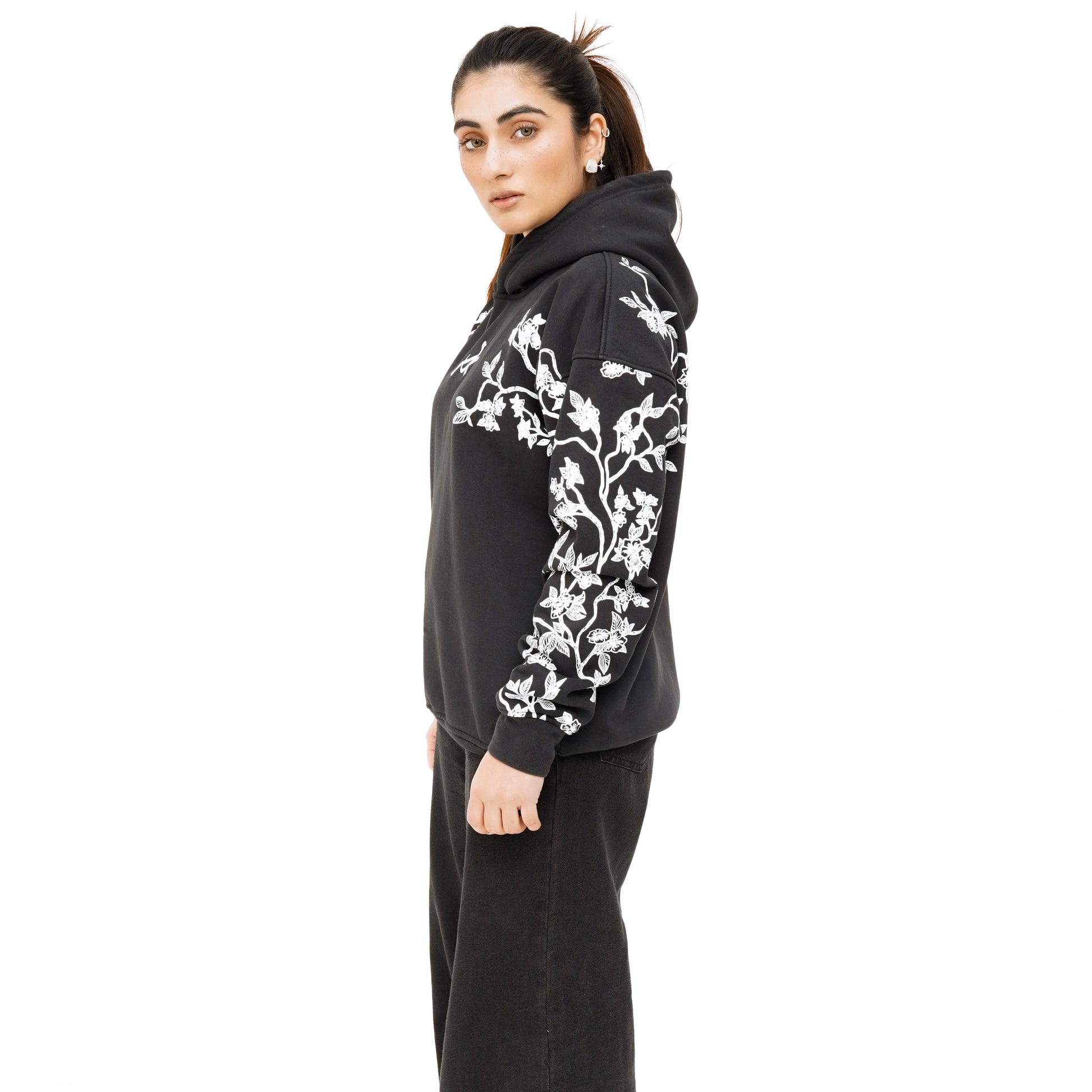 Step into a world where minimalism meets organic complexity. The Bloomline Hoodie features a deep black base wrapped in cascading vine-like motifs that breathe life into its silhouette — bold yet refined. The intricate botanical pattern weaves from shoulder to cuff, creating an artful balance between serene darkness and detailed expression.